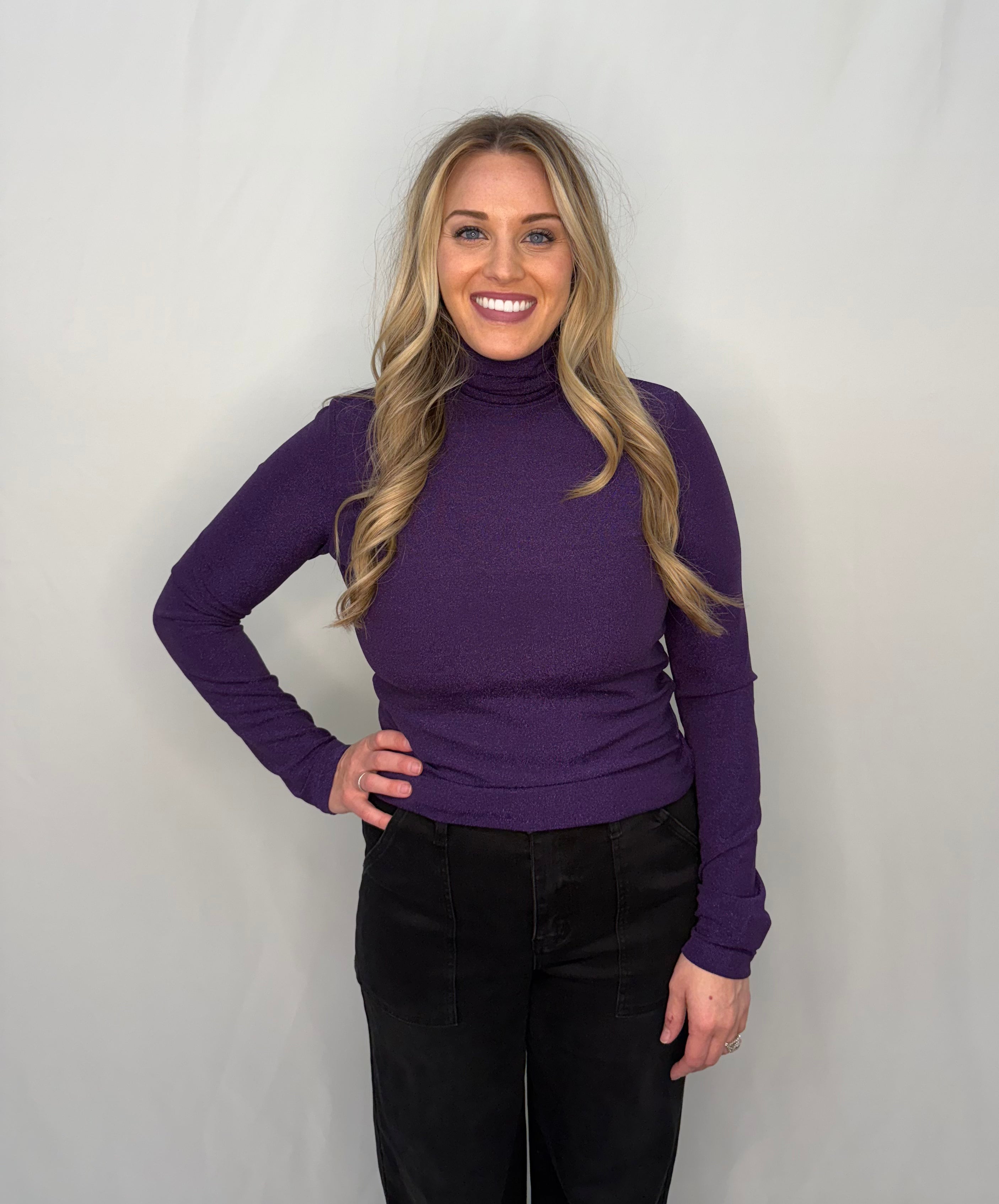 This long-sleeved turtleneck top is ideal for a festive look with its glitter-edged fabric. Versatile, it pairs perfectly with various party outfits, whether it's a glittery skirt or chic pants for extra sparkle on special occasions.