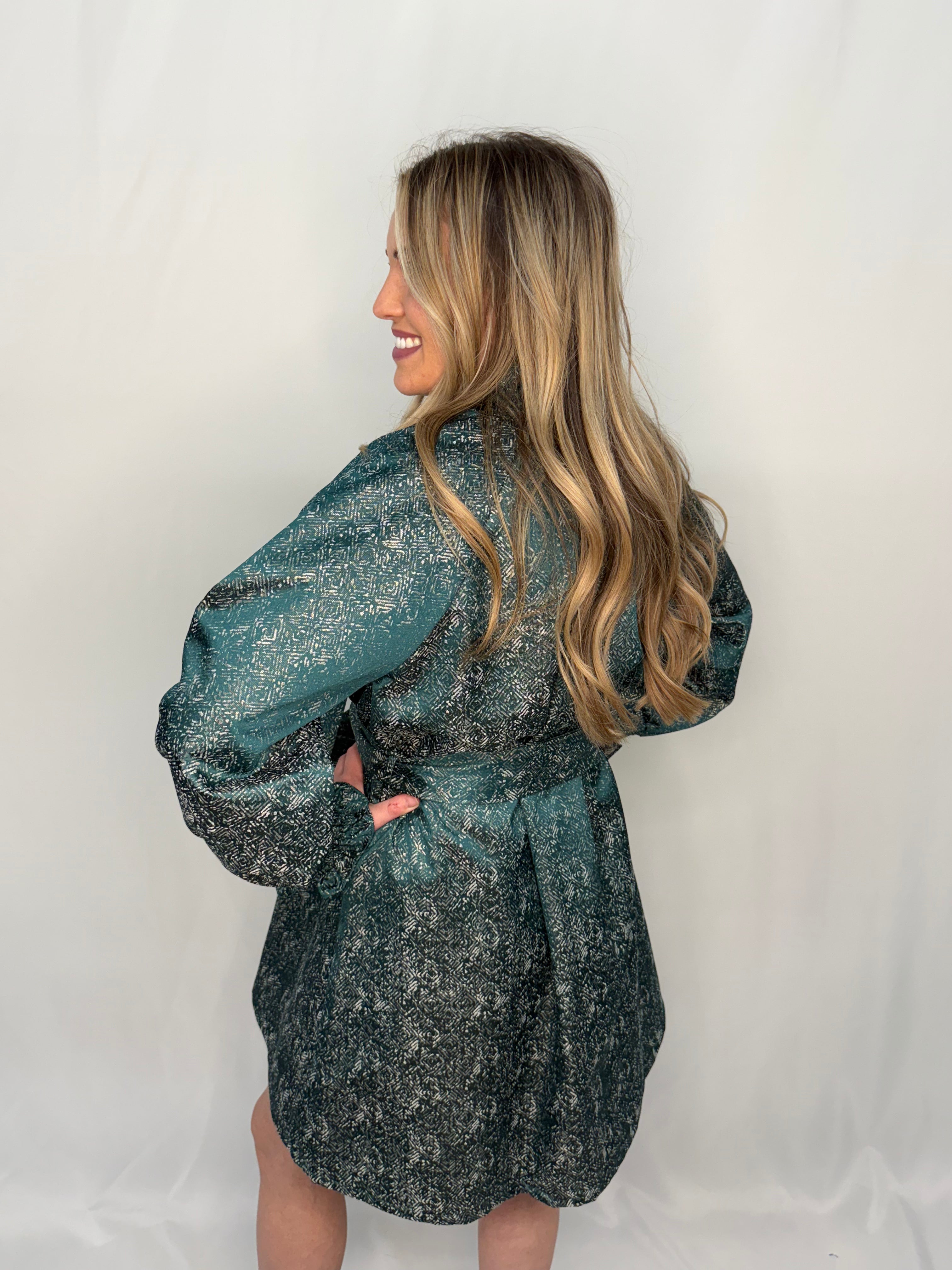 - Self tie belt at waist
