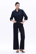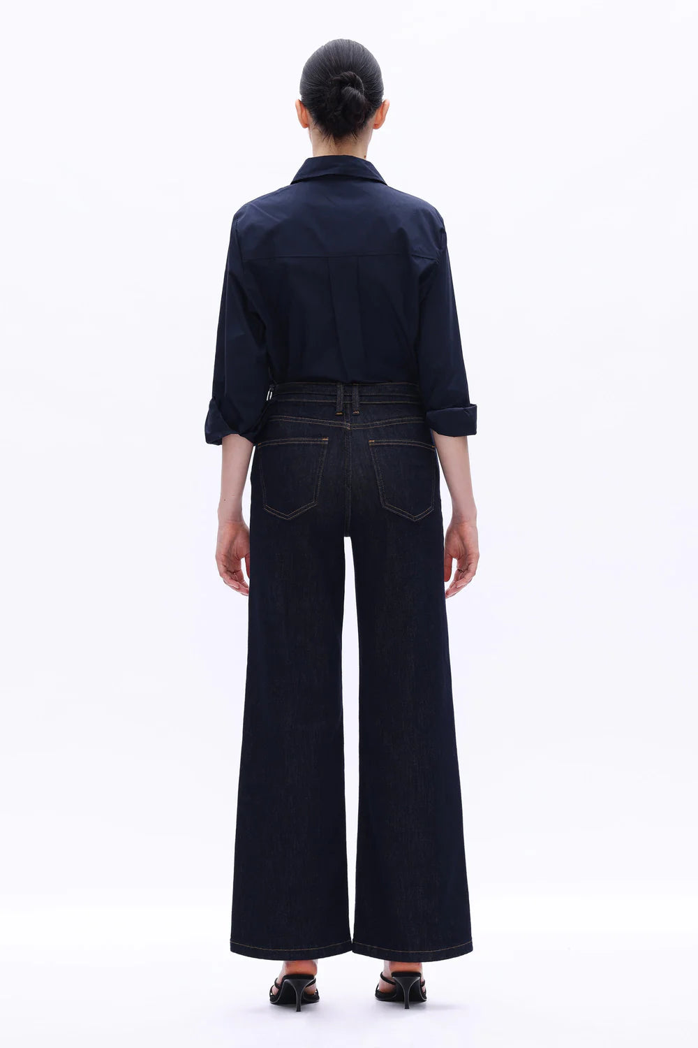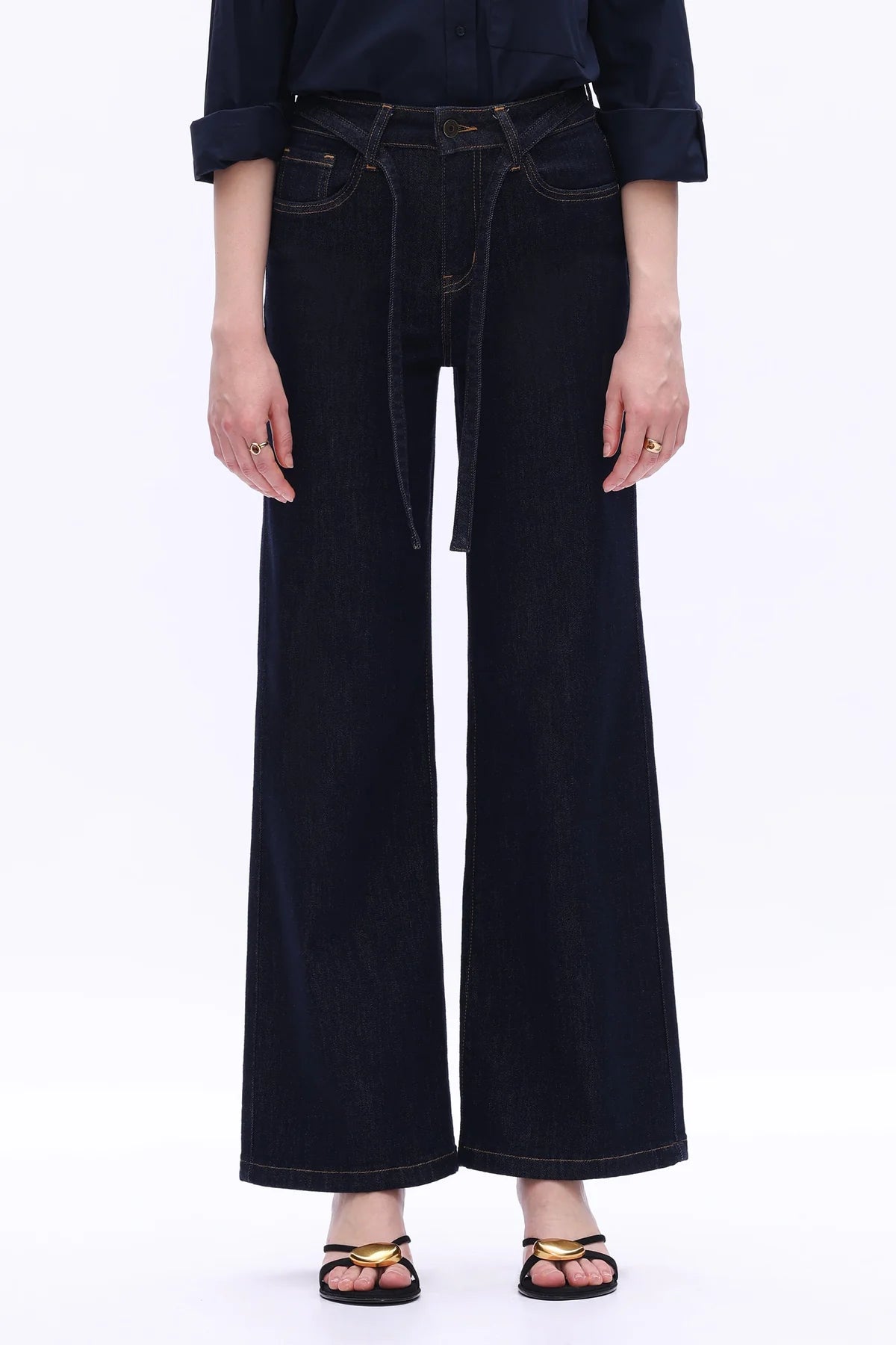 High-rise wide-leg jeans in deep blue with tie waist and clean silhouette. Flattering fit for casual chic looks, perfect with shirts or boots.