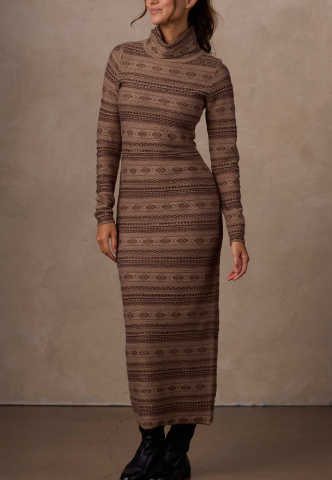 The Reverse Fair Isle Maxi Dress blends timeless pattern with a modern, curve-skimming fit. Made from a soft, stretchy sweater knit, it delivers all-day warmth without sacrificing shape. The turtleneck neckline and full-length sleeve add a refined touch, while the maxi length creates an elegant, elongated look. Perfect for holiday gatherings, dinner nights, or layered under a coat for chic cold-weather style.