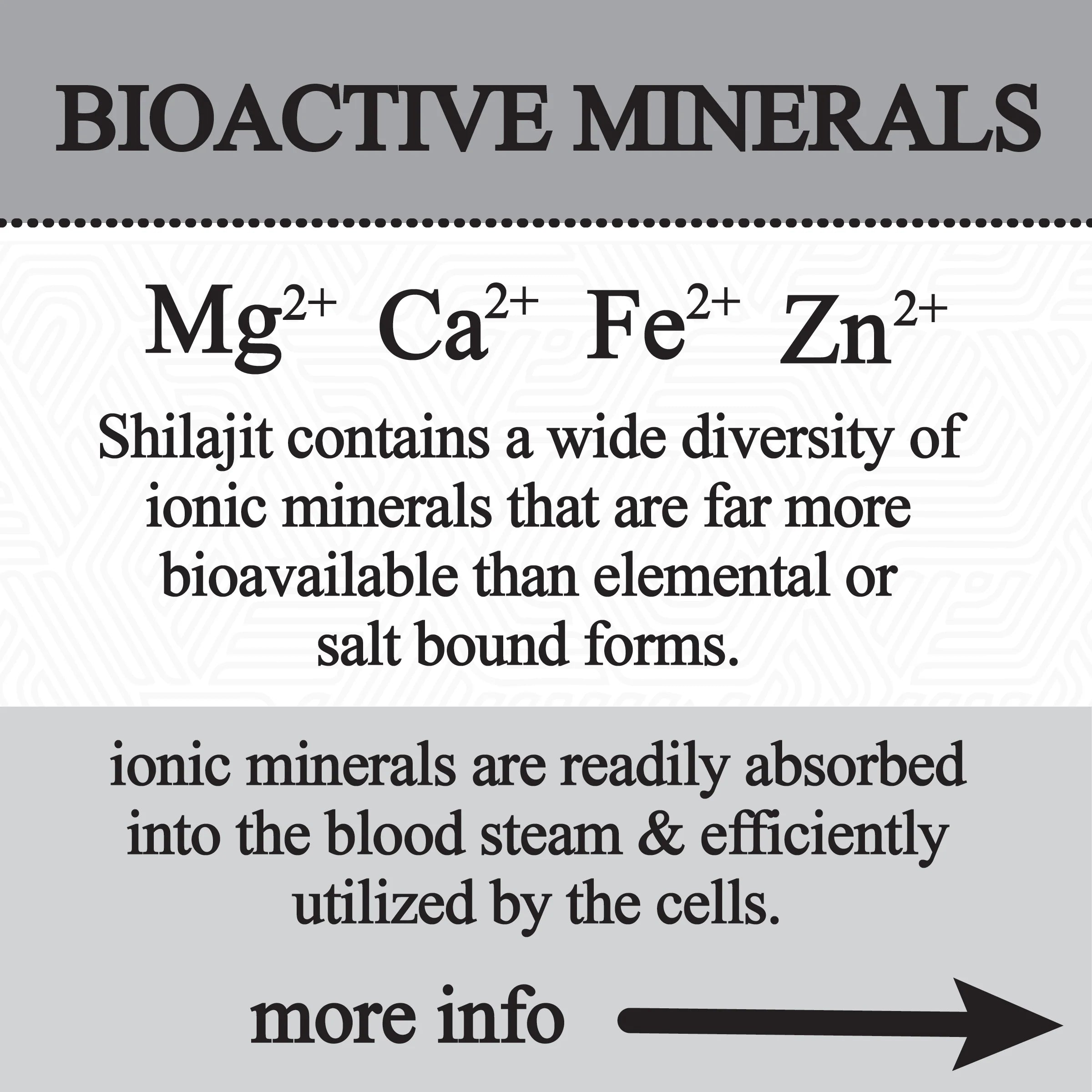 Shilajit is pretty crazy. it has 80+ minerals in their bioavailable ionic form with the addition of fulvic acid that escorts minerals to the cell and releases once across the cell wall. fulvic acid has a weak bond to ionic minerals in shilajit. it's strong enough to prevent other compounds from bonding to ions in transit that would result in a salt bound form or oxalate that is not suitable for cellular processes, but weak enough to release with changing conditions inside the cell. how could something that oozes from a rock at 16,000ft in the mountains be such a perfectly designed mineral supplement. you couldn't have designed it better in a lab. minerals play monumental roles in all mind-body systems including ATP production, eliminating free radicals, protecting cell membranes, moderating inflammation, building and deploying the immune system, building and modulating neurotransmitters, electrical signaling in the nervous system, and so much more.