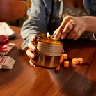 Our 12.5 oz Large Candles are hand-poured into apothecary-inspired amber jars with our signature kraft label and a brass lid.